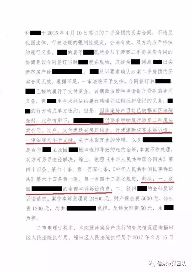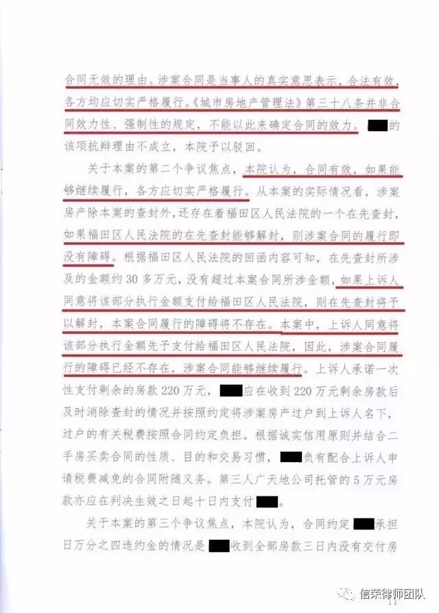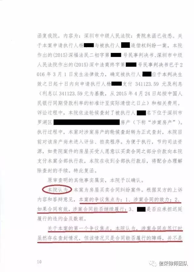 本团队对此持不同意见,并于2016年9月23日对比福田法院和罗湖法院相反判决(福田法院有三个在先查封仍判决业主继续履行合同,罗湖法院有一个在先查封,且业主债权人出庭表示同意买家代偿,仍判决不能继续履行),认为查封房屋买卖合同不但有效,而且可以判决继续履行合同办理过户手续。
